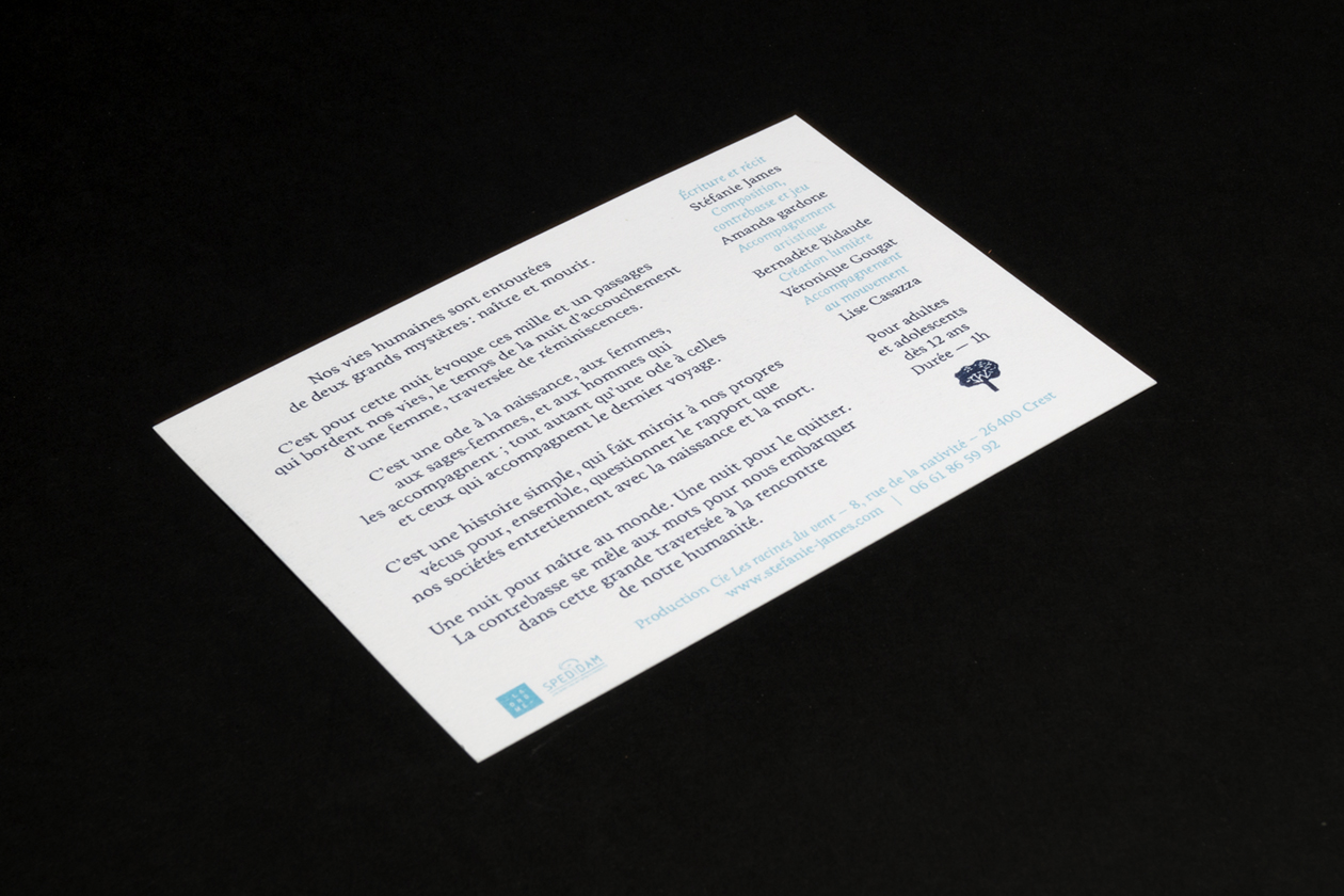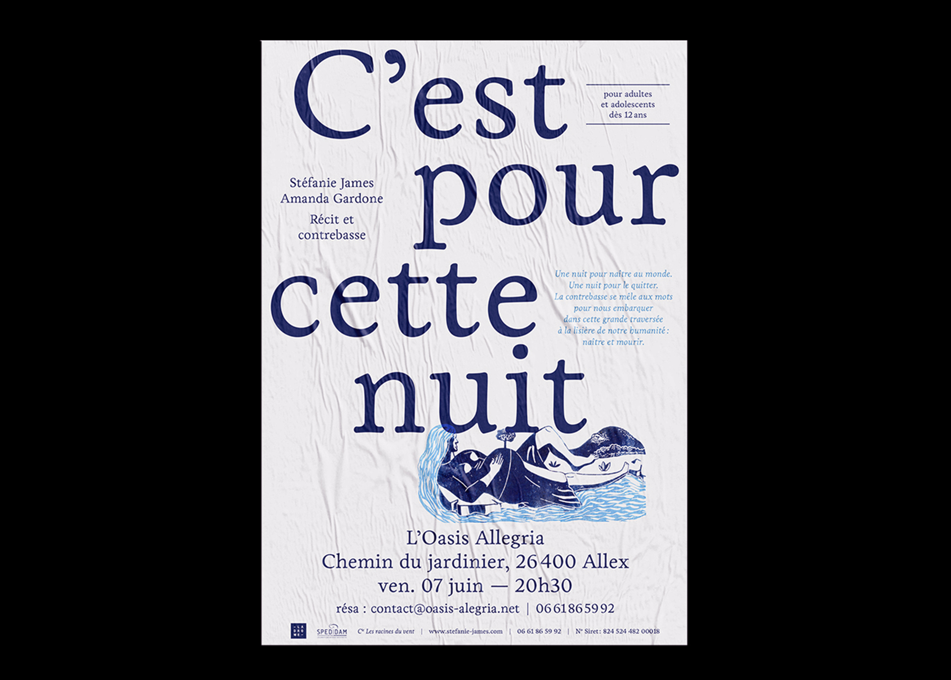 Développement de l’identité visuelle de la conteuse Stéfanie James,déclinée sur différents supports à l’occasion de la tournée du spectacle C’est pour cette nuit :
