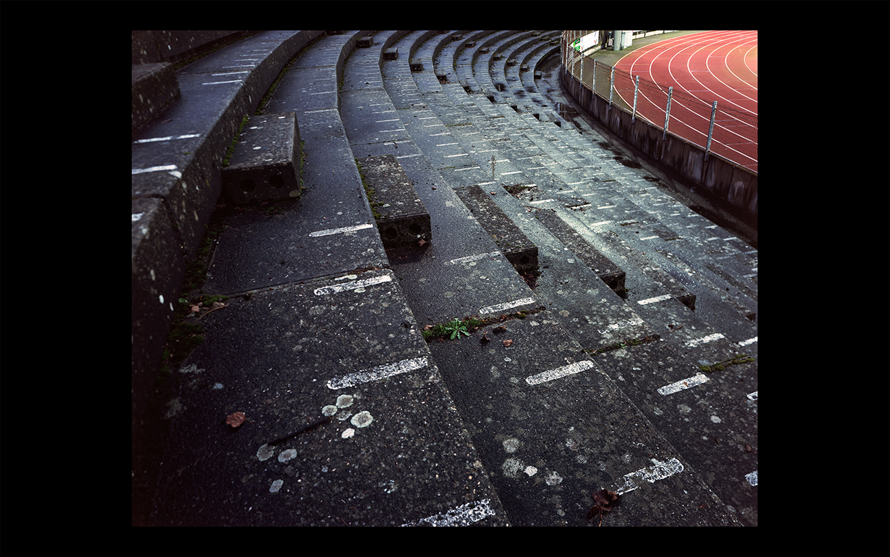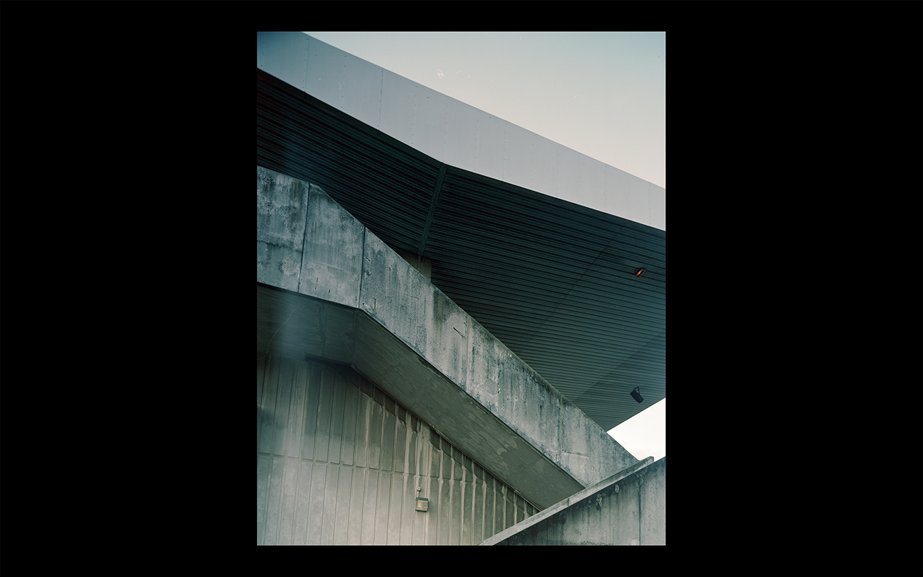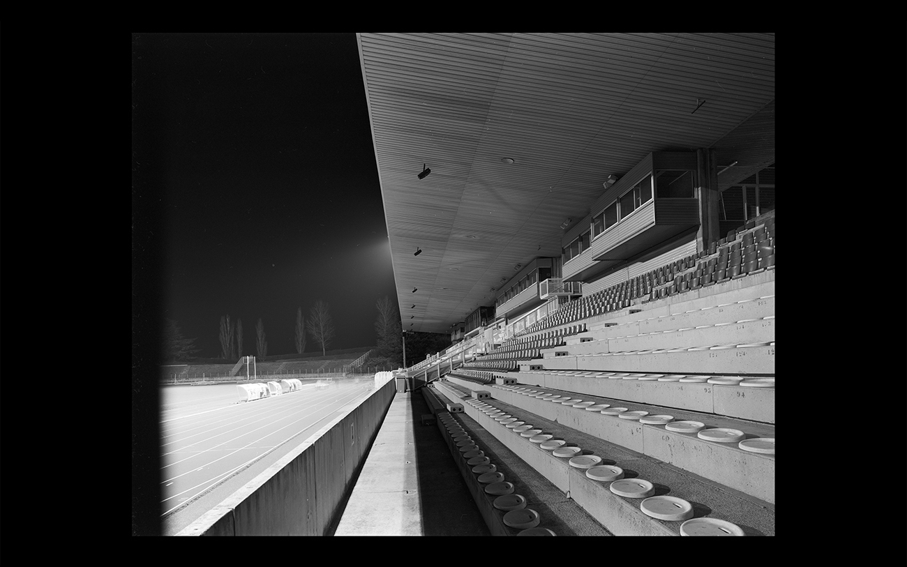 Prise de vue du Stade Georges Pompidou de Valence, réalisées à la chambre photographique. L’utilisation de la chambre permet ici de rendre compte de la masse architecturale, ainsi que de la géométrie et de la rigueur des formes.